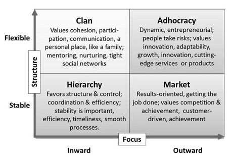 By analysing how internally and externally focused you are and how flexible and stable your structure is, we’ll find out which of four cultures your organisation favours and where it wants to be.